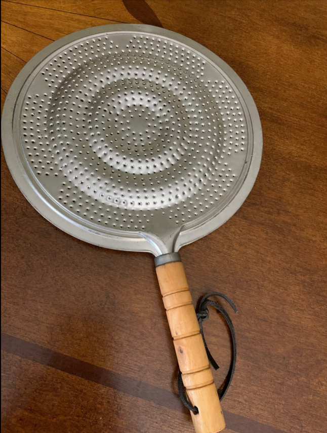 Just cast iron or steel, perforated to perfection—and a smooth wooden knob you can grab without burning your fingers.